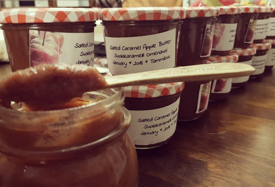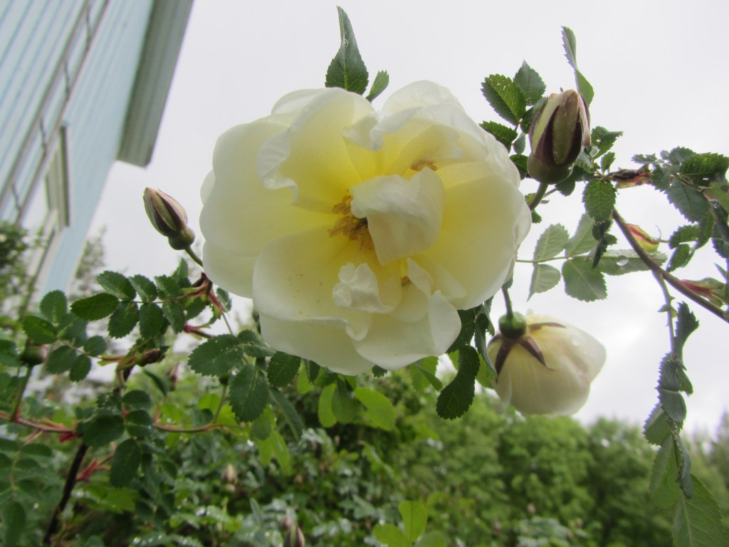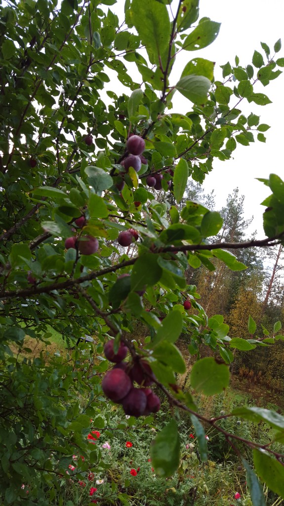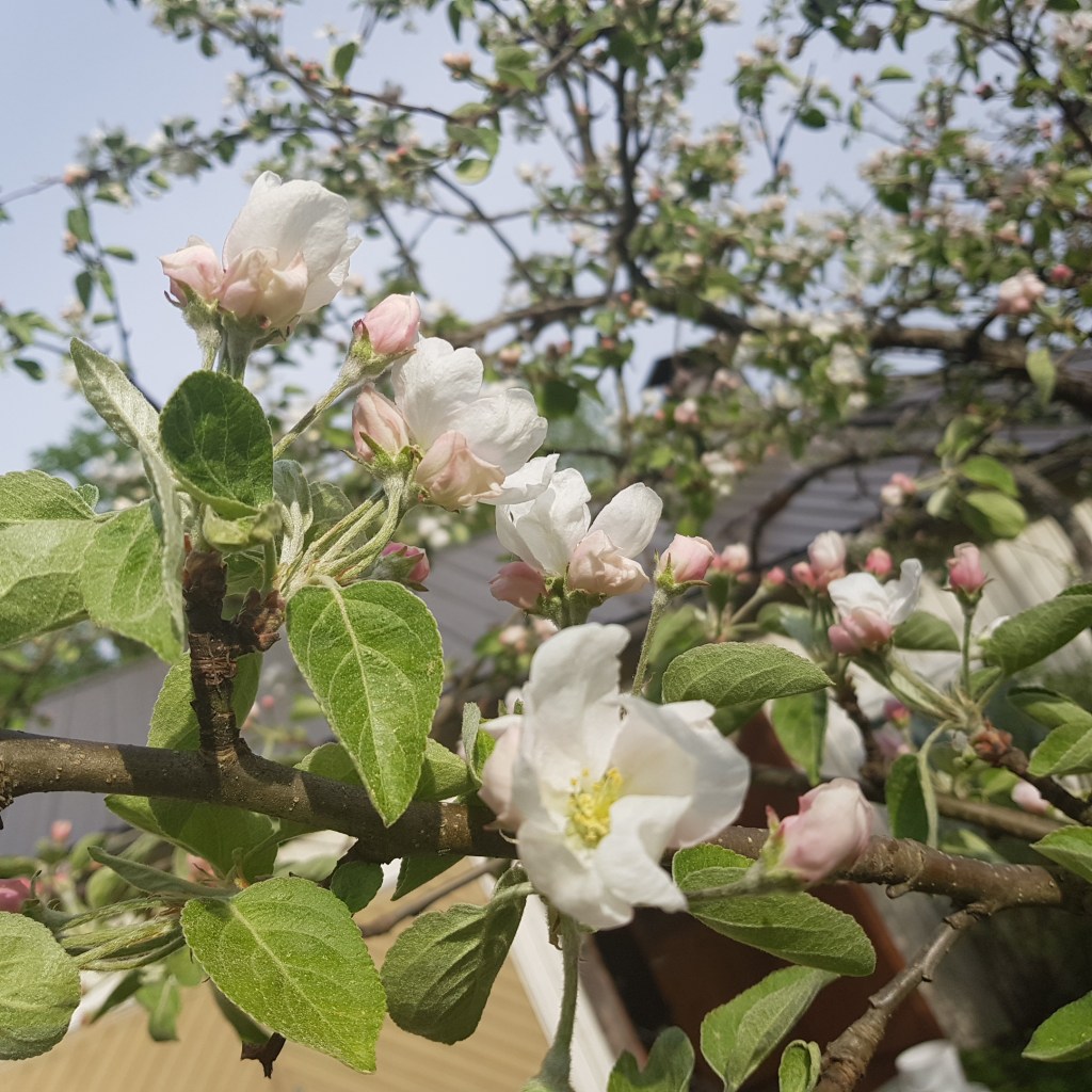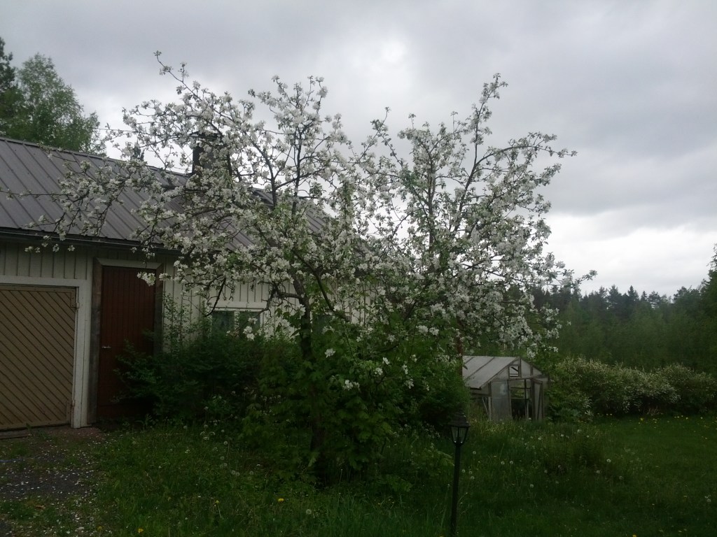 This particular tree is a cultivar called Malus domestica ‘White Transparent’ (omena ‘Valkea kuulas’), also known as ‘Yellow Transparent’ in North America. It was very popular across Europe in the 19th century and is still sold in some nurseries today. Its main claim to fame is being a very early variety that will provide ripe fruit by the tail end of summer in most places. This makes it especially nice to combine with the many soft fruits and berries that are usually ready to harvest around the same time.
