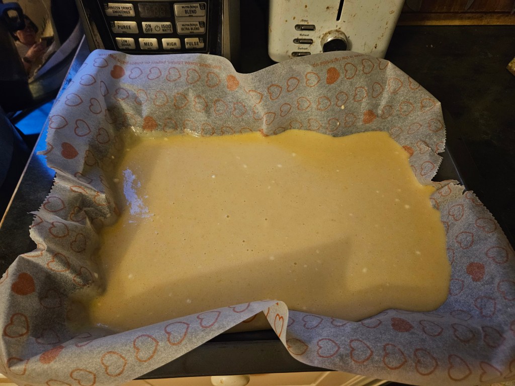 Line a baking pan with baking paper (this is the secret to easy cleanup, trust me). Pour in the batter.