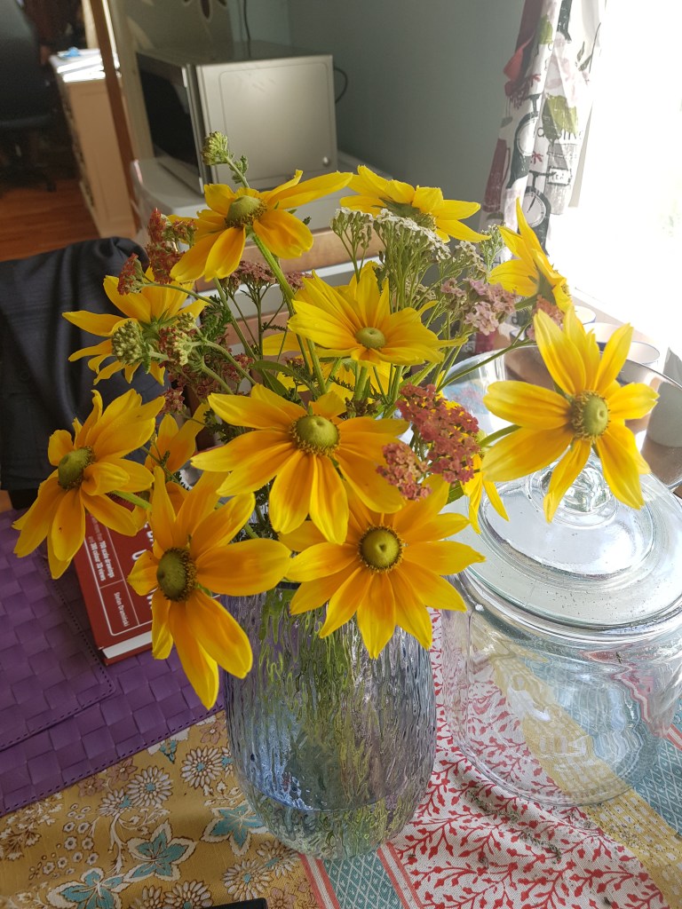 Rudbeckia hirta ‘Prairie Sun’ with mixed Achillea millefolium ‘Summer Pastels’. They were growing next to each other in the cutting garden, so I figured they might as well go into the vase together too!